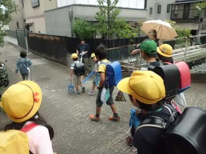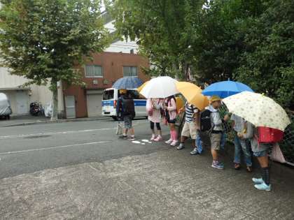 小雨の中,傘をさして一生懸命あいさつをしていました。