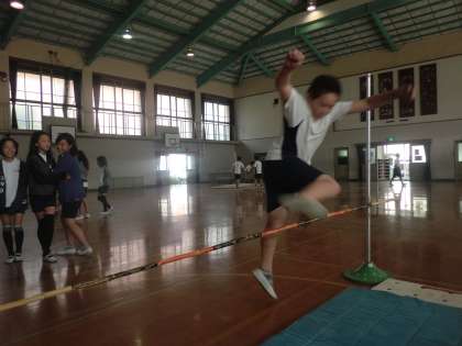 体育の時間に高跳びの学習をしました。今日は高跳びの跳び方に慣れるための練習をしました。これからバーの高さを徐々に上げていきたいと思います。