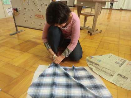 学芸会に向けて衣装作りにも取り組んでいます。型紙にあわせて生地を裁ちばさみで切りました。