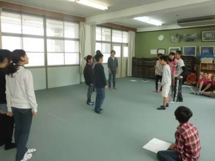 劇の練習を進めています。セリフや立ち位置を一つ一つ確認しながら,練習を進めています。