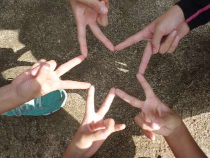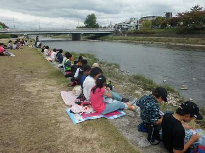 三条京阪まで電車で行き,鴨川河川敷でお弁当を食べました。お弁当後は,少しだけ自由遊びの時間がありました。女の子は,「5人の指で星づくり」にはまっている様子でした。