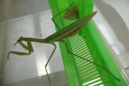 1か月以上飼っているオオカマキリのメス。前に2こたまごを産みましたが,また昨日,1こ産みました。これで3つです。お尻にはまだ,たまごがついていました。オオカマキリってこんなにたまごをうむんですね!子どもたちは早速このネタを「ビッグニュース新聞」にしていました。