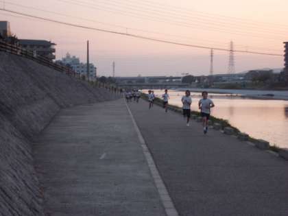 支部駅伝予選会・マラソン大会に向けて毎日練習を頑張っています。鴨川で1500mの自己最高タイム順にスタートする練習をしました。後からスタートする友だちに抜かれないように一生懸命走りました。その結果自己最高記録を更新!!頑張ったね。