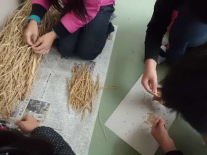 総合的な学習の時間にみんなで育てていた稲をグループで脱穀しました。