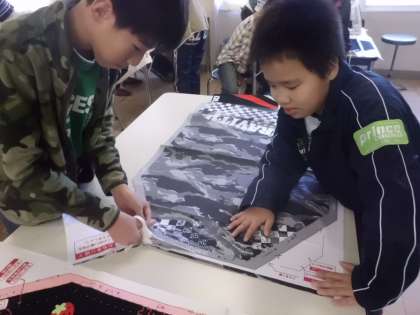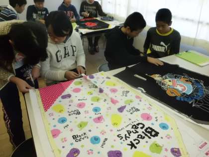 今日からエプロン作りを始めました。まずは,切り取り線に沿って,エプロンの型を切り取っていきます。友達と協力しながら,効率よく進めていました。