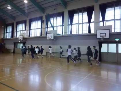 雨のため,体育館で朝マラソンを行いました。来週はいよいよ大文字駅伝予選会です。