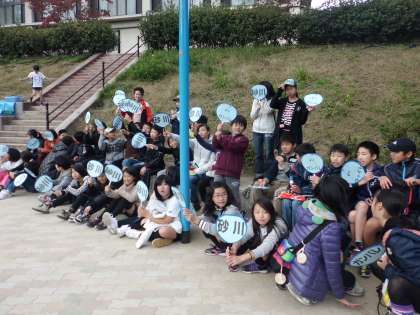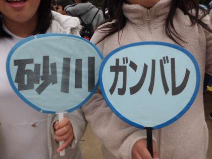 予選会に選手として出場する子以外に,たくさんの子どもたちも応援に来てくれました。応援のうちわをもって,応援隊も気合い十分です。