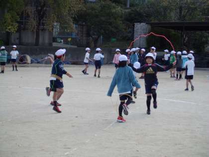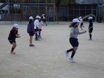体育でマラソン大会の練習の前に,なわとびをしています。