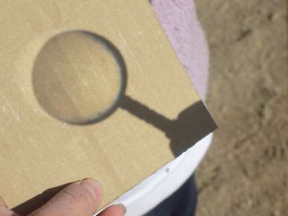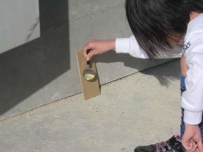 虫めがねで光をあつめると,鏡であつめたときと同じように明るくあたたかくなるかを調べました。
