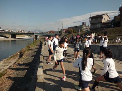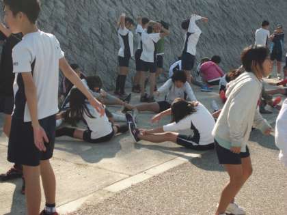 まもなくマラソン大会スタート!準備体操も念入りにします。
