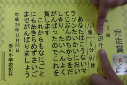 マラソン大会,みんなよくがんばりました。一人ひとりに「おつかれさま!よく頑張ったね!」の気持ちをこめて,完走賞を渡しました。とてもうれしそうに受け取り,友達と結果を見せ合っていました。おうちの人にはやく見せたい様子でした。