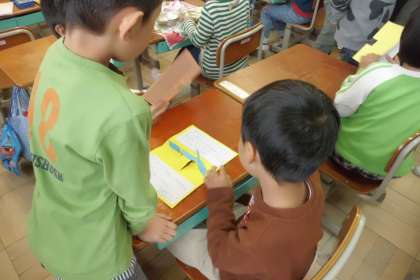 給食の時間に1年生の教室へお邪魔して,招待状を渡しに行きました。びっくりさせたくて,後ろにカードを隠しながら1年生のほうへ行く子もいました。渡したあと,1年生に読んで聞かせてあげている子もいました。「背中からジャーンって出したら笑ってくれたよ。」「かわいいカードでうれしいって言ってくれた。」と1年生の反応にとても満足げでした。