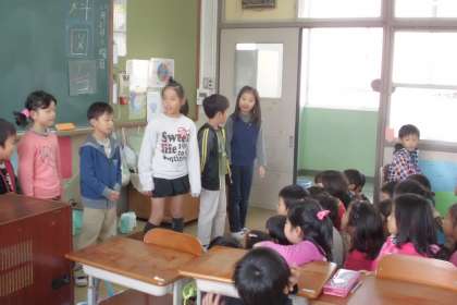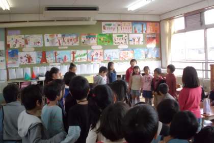 1年生の前でまずははじめのことば。1年生はきらきらした目でお話を聞いてくれました。その後は,コマーシャルタイム。どこでどんなお店をするのか,1年生が行きたくなるように宣伝をしました。さあ,いよいよスタートです。