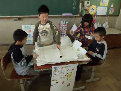 「パチパチバトル」です。キャップを指ではじいてラップの芯に当て,ラップの芯が相手の陣地まで入ると勝ちです。なかなか難しそうです!