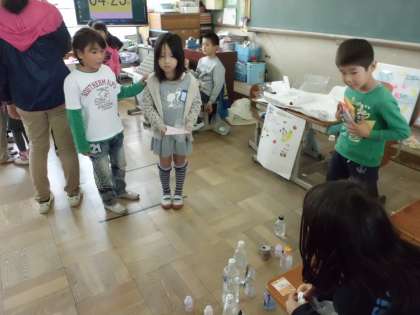 「スペシャルボーリング」です。空き缶やガチャガチャのケースなどで作った様々なボールの中から1つ選び,ペットボトルのピンをめがけて転がします。ピンによって点数が違います。高得点目指してがんばりました。