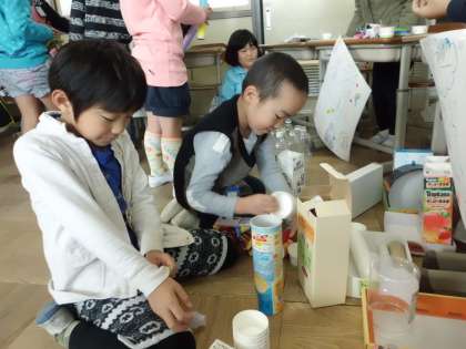 「つむつむタワー」です。プリンカップや空き缶などを積んでいって,たくさん積めた方の勝ちです。どこまで積めるかな?!