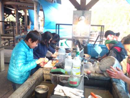 冷たい水にも負けず,食器や野菜を洗っています。