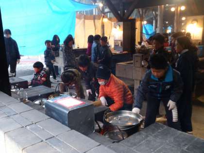 美味しい夕食を作るために,先生も協力しています。