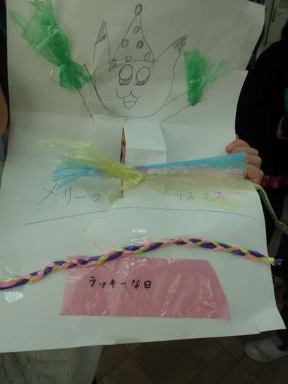 昼休みに,お誕生日係がクリスマス会を開いてくれました。開くにあたり,1週間ほど前から,休み時間にプレゼントや飾りを一生懸命作っていました。