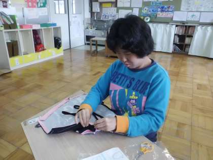 最後はひもを通します!しゃくとり虫のような動きで1・2 1・2