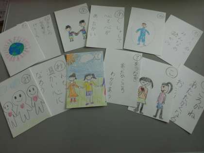 朝会の校長先生のお話を思い起こしながら,人権かるたを作りました。