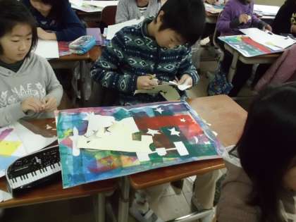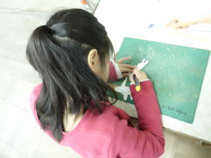 最後に黒いインクを塗る前に最後の形をシールで貼っています。