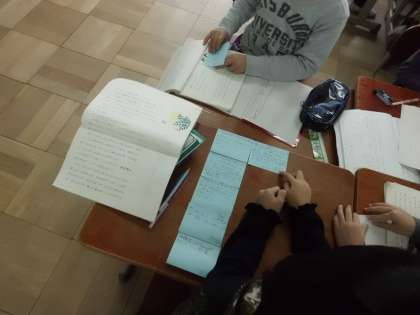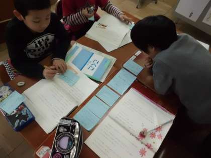 それをグループのみんなで見合いながら,お話の順番に並べ替えています。