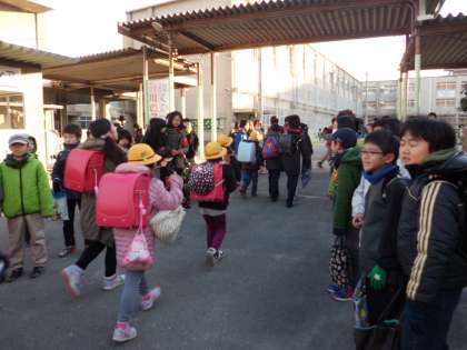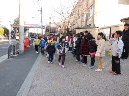 登校した人から校門のところに並び,女性会の方々といっしょに元気にあいさつをしました。
