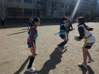 腰に付けたタグをとると,ボールを手放さないといけません。タグをとられないよう,必死に逃げたり見方にパスを回しながら取り組んでいます。