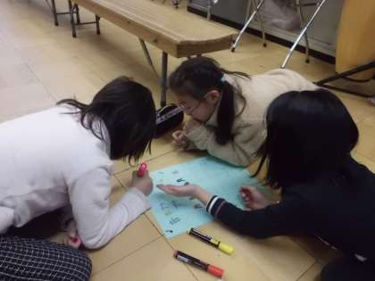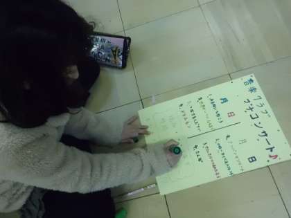 今回,1年の締めくくりとして,音楽クラブによる「プチコンサート」を開催しようということになりました。これまでに練習した曲を,何日かに分けて中間休みに発表する予定です。今日は,プチコンサートの計画をみんなで立て,校内に掲示するポスターを作りました。