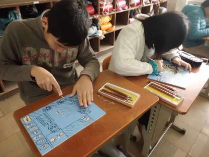 黒と白のバランスを考えながら,彫り進めています。今日で数名が彫り終わりました。次回はインクを付けて一度刷ってみたいと思います。