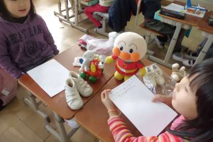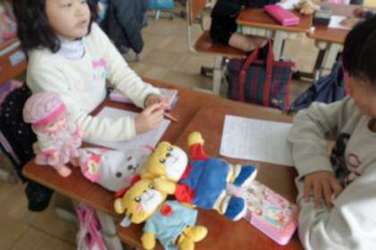 生活科「ひろがれ わたし」では,今までの自分の成長についての調べ学習をしています。今日は,小さい頃に使っていたものをおうちから持ってきて,どんな時に使っていたか,誰からもらったかなど,その思い出のものについての友達からの質問に答えていました。「これが無いと泣いていたよ。」「今は,妹のものになっているよ。」と楽しそうに話していました。