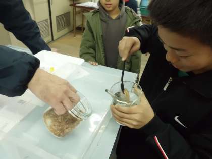 コーヒーシュガーや食塩がどのように水にとけるのか実験しました。