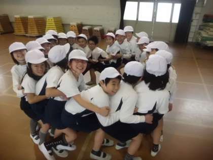 「せーの」のかけ声で一斉に後ろの人の膝に座りました。すると,見事1回で成功しました。心が一つになりましたね。