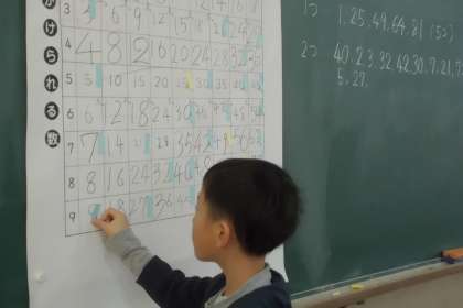 算数「九九のきまり」では,九九の表を見て同じ答えのものがいくつあるか調べ,数ごとに色分けして整理しました。「2つのものはすごく多いよ。」「答えが3つあるものは,そのうちの一つは,かけられる数とかける数が同じかけ算の答えだよ。」などと,それぞれいい気付きをしていました。