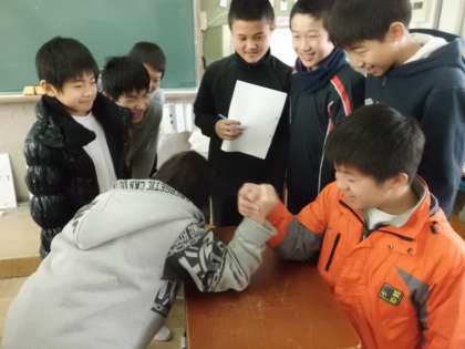 卒業アルバムのクラスのページに,「2組の腕相撲ランキングを書こう!」ということになりました。休み時間に,男女別に分かれて腕相撲大会で盛り上がっていました。