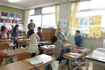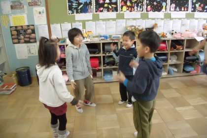 「こぎつね」の歌が大好きな子どもたち。グループに分かれて,「こぎつね」の歌に合う動きをつけました。お化粧の真似をしたり,小首をかしげてみたり,こぎつねになりきって踊っていました。