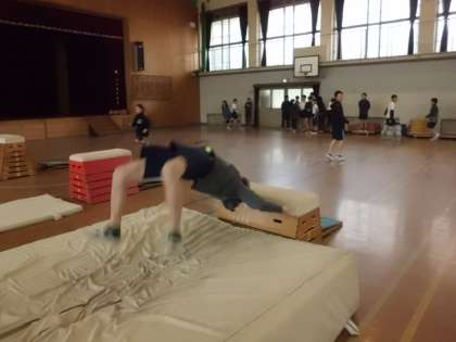 今日からとび箱の学習が始まりました。今,子どもたちが挑戦している技は,「台上前転」「頭はねとび」「あおむけとび」「かかえこみとび」です。特に,頭はねとびに夢中になっている様子です。安全に気を付けながら,楽しく学習に取り組んでいきたいと思います。