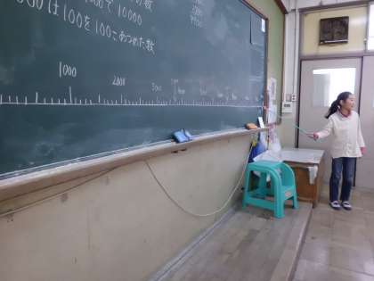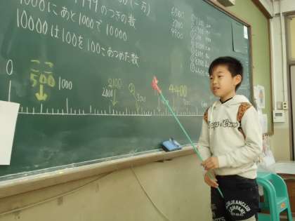 算数「10000をこえる数」では,10000までの数の直線の読み方を学習しました。「100ずつとんでいるから,ここは3500です。」などと,目盛りをよく見て考えることができました。