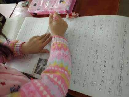 国語「スーホの白い馬」では,初めて読んで思った感想を書きました。感想を書き終わった後は,みんなの前で発表しました。「スーホは白馬のことが大好きなのだとよく分かりました。」「とのさまはひどい人だと思いました。」「馬頭琴の詳しい作り方を知りたくなりました。」などと,感性豊かに書いていました。