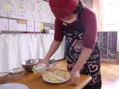 「みたらしポテト」チームです。かたいさつまいもを切るのに苦戦しましたが,無事に切り終えました。ホッ。