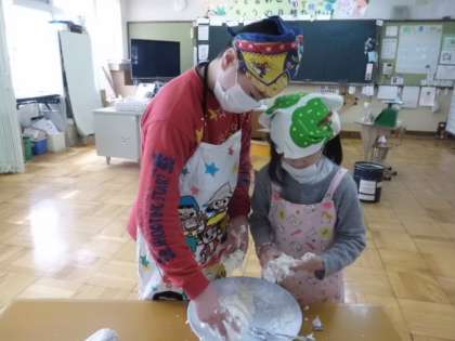 もち状になった生地は手にべったりとついて大変でした・・・。が,手や生地に粉をつけるなど工夫をして,なんとか生地で苺をつつむことに成功しました♪