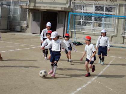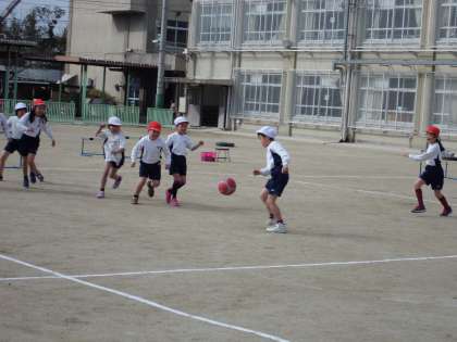 体育では「ボールけりゲーム」をしています。みんな,夢中になってボールを追いかけたり,積極的にシュートをうったりしています。仲間同士,声のかけ合いも聞こえるようになりました。
