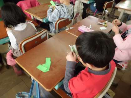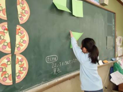 算数「分数」では,正方形,長方形,丸といった色んな形を半分にする方法を考えました。「角をしっかり合わせて紙を折ると,きれいに半分になるよ。」「切り離した後は,重ねてぴったりだったら半分になってるよ。」と,活動の中で色んな気づきができました。