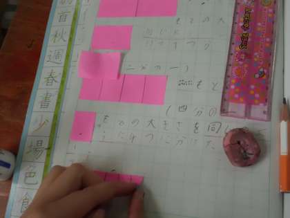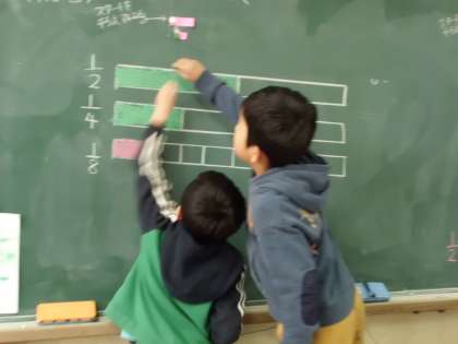 算数「分数」では,2分の1,4分の1,8分の1の意味や表し方を学習しました。「先生,2分の1って聞いたことあるよ!」「同じ2分の1のものでも,もとの長さが違ったら違う大きさになるよ。」と,活動をしながら分数の基礎知識を身につけていました。