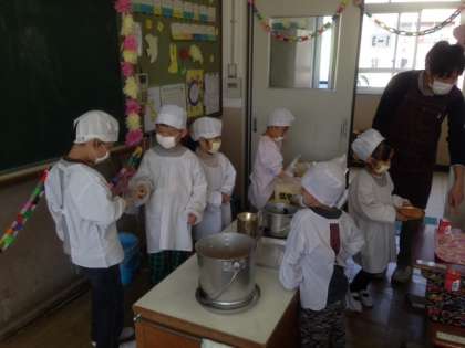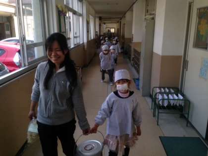 給食室から並んで静かに,運んでいます。教室では,配膳そして,早くも「多くして!」と手が挙がっています。