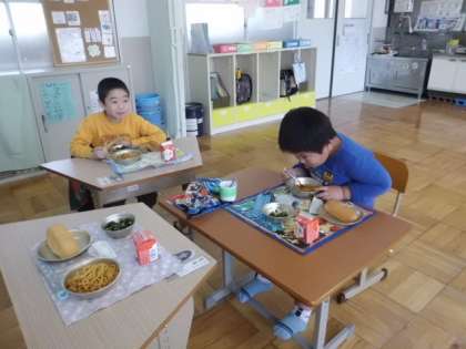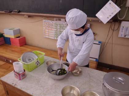 今年度初めての給食がありました。みんな楽しみにしていたので,とても嬉しそうでした♪1年生は初めての給食当番に挑戦!小さいおかずを食器に入れたり,運んだり・・・よく頑張りました。