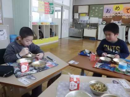 みんなでお話をしながら楽しく食べました。おかわりもしてモリモリ食べていましたよ。これからも好き嫌いなくなんでも食べて強い体を作りましょう!