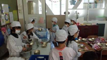 給食当番を始めて2日目。仕事の内容について分かり,何も言わなくても自分たちで動けるようになってきました。盛り付けも量や個数を考えて入れられていました。今日は,食器についたごはんつぶをきれいに取ろうとがんばっていました。ピカピカの食器で返せるといいですね。