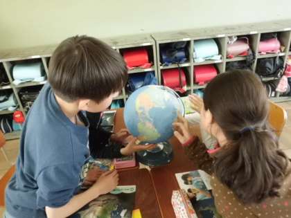 地球儀で地球の様子を見て,見つけたことを発表し合ったり,不思議だなと思ったことを発表し合ったりして,学習を進めていきました。